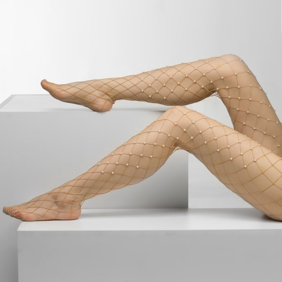 Beige Fishnet Tights With Pearls Large Fishnet Stockings Lingerie Hosiery Bling Tights Aesthetic Clothing Lolita Christmas Gifts